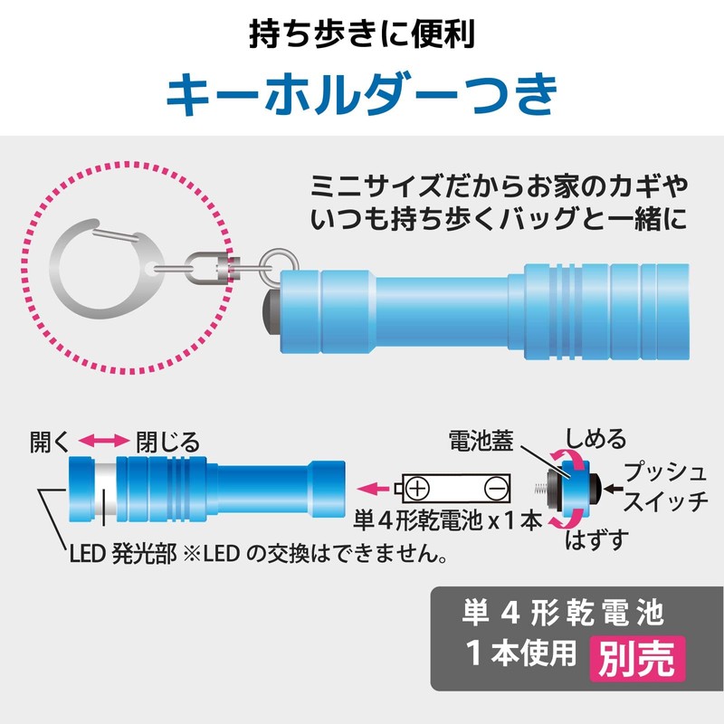 - Specifications: Power Supply: 1 x AAA battery (sold separately); Light Source: 1 x White LED (cannot be replaced); Maximum Current Consumption: Approx. 134mA; Continuous Usage Time (when using new alkaline batteries): Approx. 11.5 hours to 10% brightness; Luminous Flux: Approx. 18 lm (lumen); Illumination Distance: Approx. 26 m