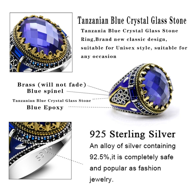 OHMMHO Anillo de joyería turca para hombre con piedra de vidrio azul de ley 925 clásico con corona de rey y circonita cúbica, regalo para mujer y hombre, Metal precioso., Ágata