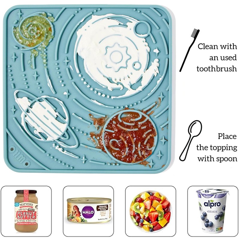 - The lick mat slow feeder aids in slowing down your pets' eating pace, thereby effectively extending their mealtime. The distinctive cosmos maze design gently removes food particles from your pet's tongue, promoting healthier teeth, gums, and breath.