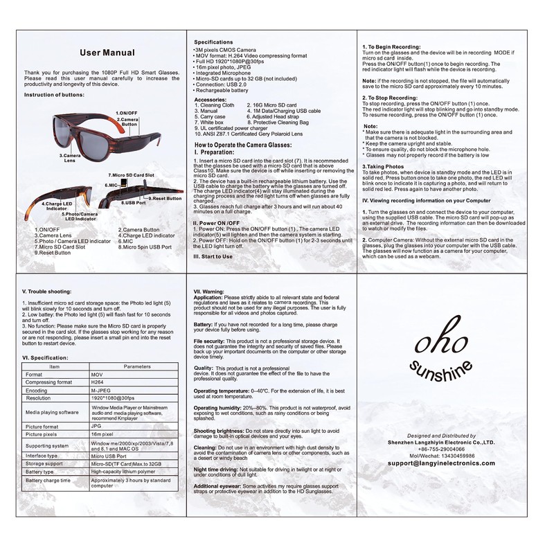 - Ultra HD 1080P video recording: video sunglasses is recording Ultra full HD resolution video with audio and shooting 16M Pixel photo By 16G supplying memory card