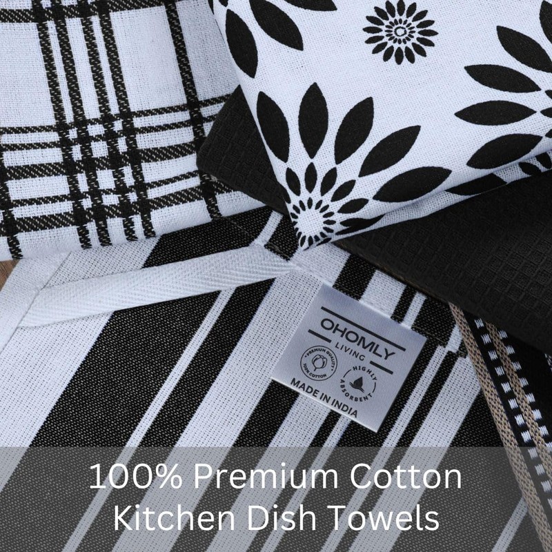 OHOMLY LIVING Assorted Kitchen Towels Set of 5-100% Cotton Dish Cloths Towels with Hanging Loop - Soft, Absorbent & Washable for Kitchen Use - Quick Drying Dish Towels 16x26 Inch Black