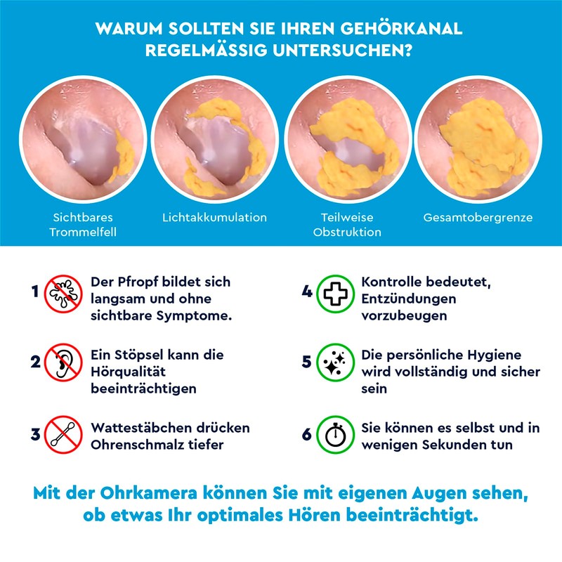 - ✅ Die regelmäßige Kontrolle Ihres Gehörgangs trägt nicht nur zur Aufrechterhaltung einer vollständigen und sicheren persönlichen Hygiene bei, sondern beugt auch Entzündungen, Infektionen und potenziell riskanten Situationen vor