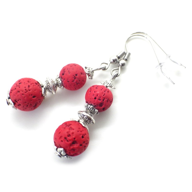 Ohrringe aus Edelstahl mit roten Lavasteinperlen und silbernen Messingperlen