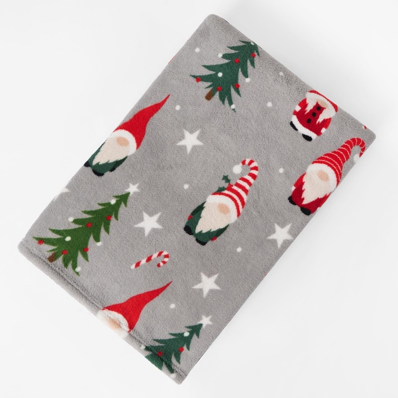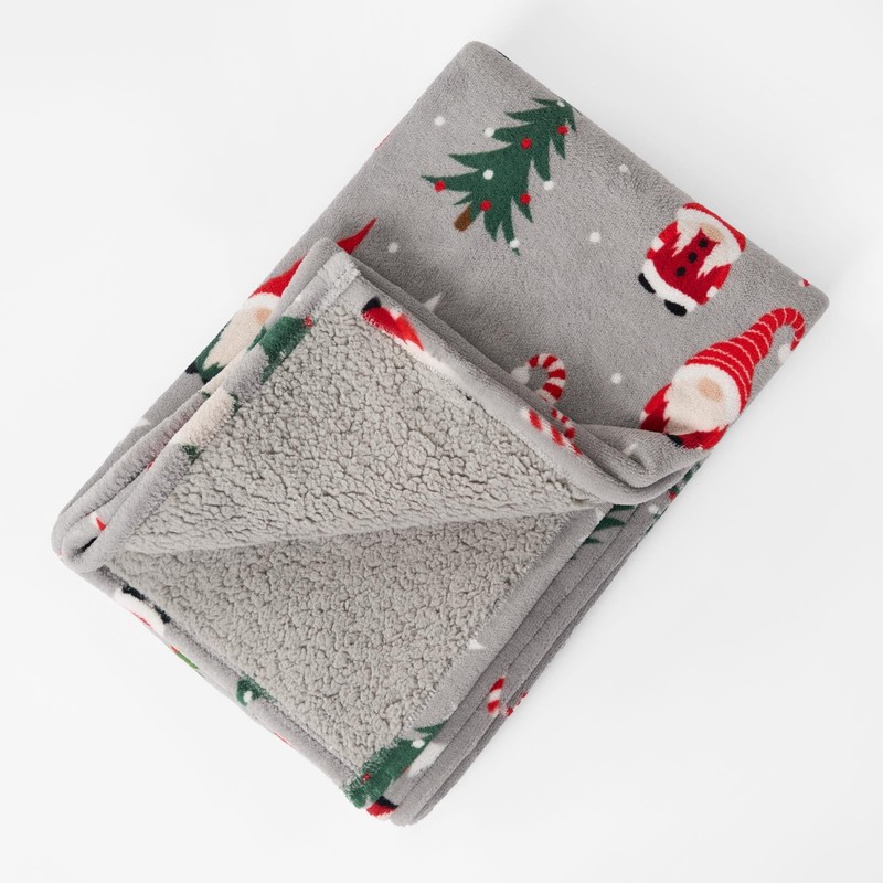- Grey blanket throw featuring decorative Christmas gonks, Xmas trees and stars design. Soft sherpa reverse made from 160gsm fleece and 180gsm sherpa reverse. Easy care Christmas blankets is machine washable at 40°C and tumble dry on low heat.