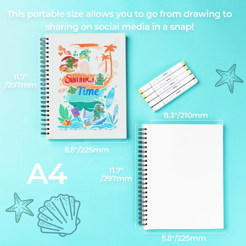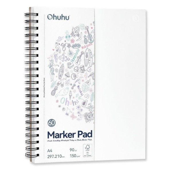 Ohuhu Sketchbook A4 - Bleedproof, 60 Sheets/120 Pages of 150GSM Smooth Thick Drawing Paper, A4 Large Paper Size, Spiral Bound Double-Sided Marker Pad Art Book for Alcohol Markers Christmas