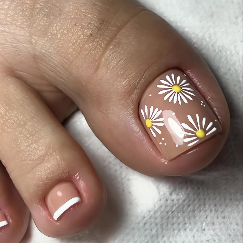 OHWODA Daisy Flower Press on Toenails Short Square Fake Toe Nails Glossy Nude White French Tips Artificial Toenails Summer Glue on Toenails Reusable Stick on Toe Nails for Women and Girls, 24Pcs