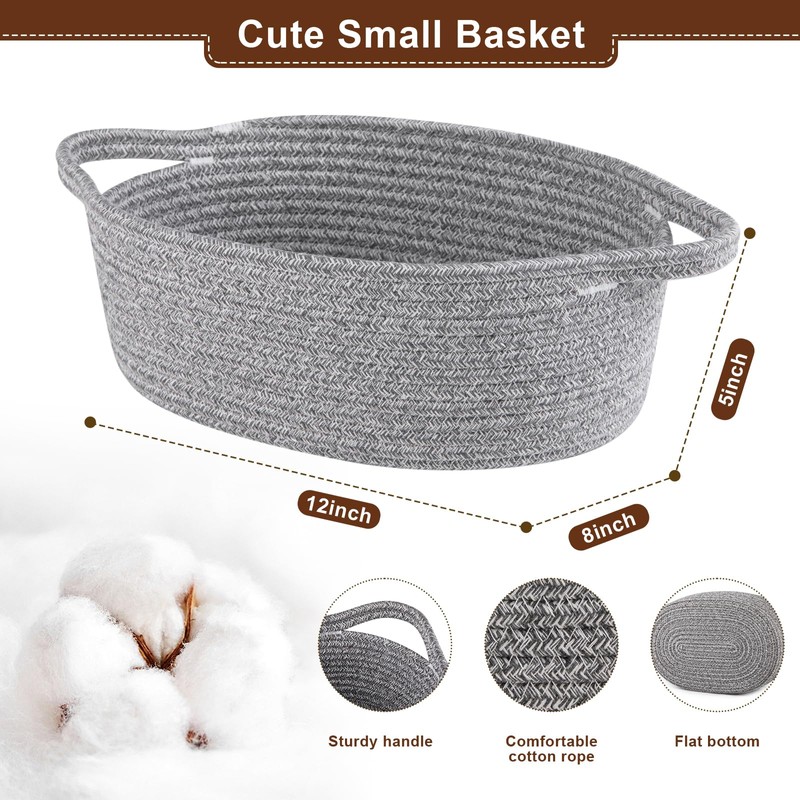 OIAHOMY Cute and fashionable small basket, empty gift basket for storing keys, toys, remote control and other small items, cotton rope basket for various scenes, can be used as a gift basket, toy basket, desktop organizer basket, etc. Size:12x 8 x 5 inches Sturdy and durable gift basket made of woven cotton rope with handles for easy movement, can be used in various places such as bedroom, living room, children's room, bookshelf and so on.