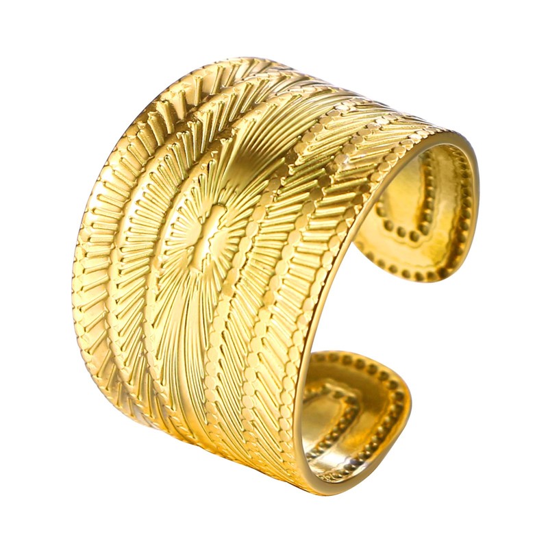 - 【Exquisite Sun Ray Pattern】The chunky gold ring's surface is adorned with a detailed, three-dimensional sun ray pattern, adding a touch of artistry and design flair. This makes it a standout piece for individual style, suitable for both solo wear and stacking with other rings to create a personalized look.