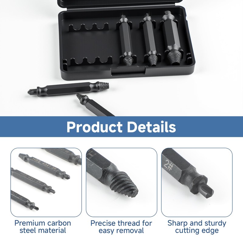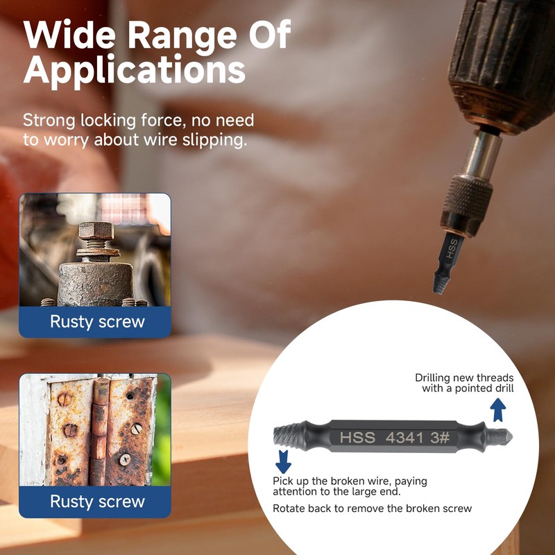 - Sturdy HSS Alloy Steel: This screw removal tool is made of high-quality HSS alloy steel with excellent hardness and wear resistance, ensuring reliable performance even under harsh working conditions