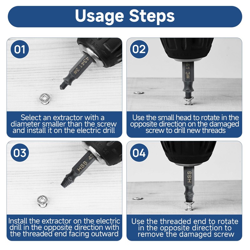 - Easy to operate: Just use the drill end to drill a pilot hole in the screw, and then use the threaded end to remove the damaged screw. This screw extractor set is compatible with standard hand drills and requires no complicated steps