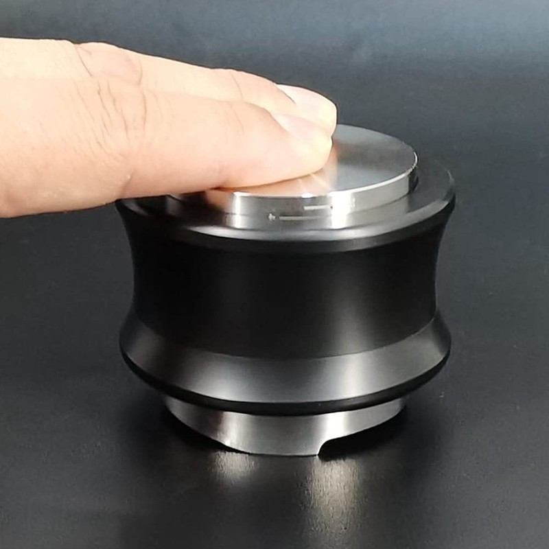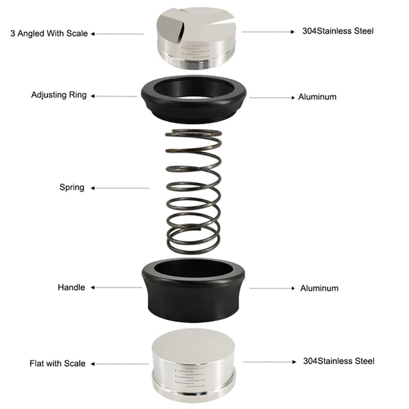 • Coffee products with integrated dispenser and tamper. Before tamping, the four-page spiral design distributor is used to evenly distribute the coffee powder to consistent pressure and uniform every time the tamping is done.