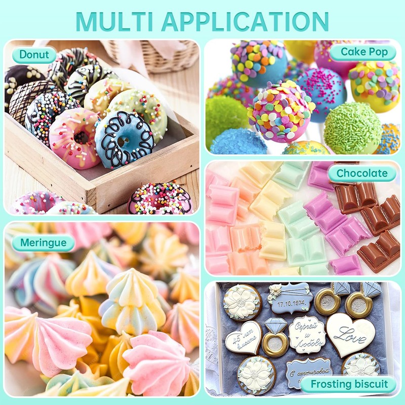 - INFINITE APPLICATIONS - Perfect for chocolate, buttercream, meringue, cake pop, ganache,candy melts, macarons, fondant, icing, sensory bottles and other can soluble with butter, fat and oil substances.(not for water and beverages)