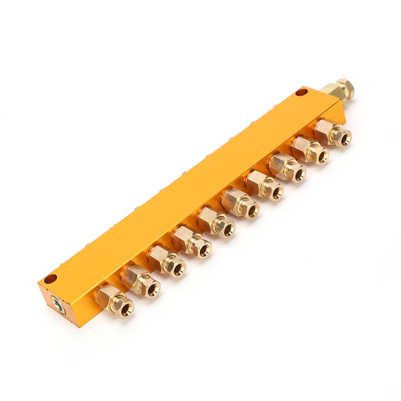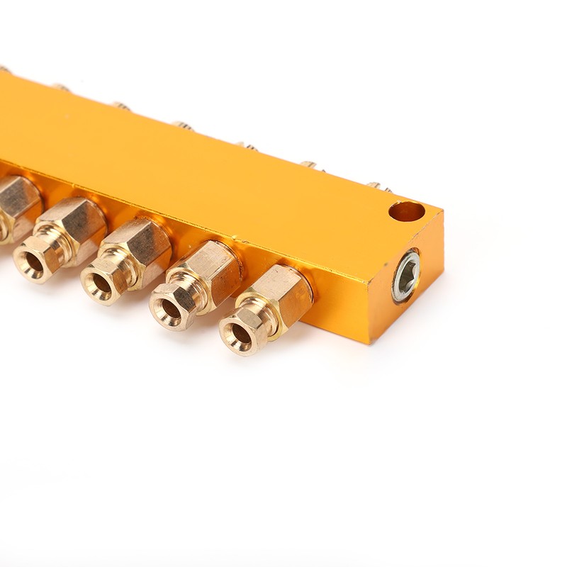 1、Made of high-quality stainless steel, anti-rust and corrosion-resistant, it can be used in harsh environments. 2、With 1 oil inlet and 10 oil outlet, the main inlet is connected with 6mm oil pipe, and the branch port is connected with 4mm oil pipe. 3、The oil distributor is equipped with a regulating valve, which can adjust the oil volume of each oil outlet, and is used in a resistance type oil injection system. 4、The oil separator has a simple and compact structure, and is easy to adjust and distribute evenly. 5、Suitable for the lubrication system of mechanical equipment in CNC machining, die‑casting machinery, woodworking machinery and other industries.