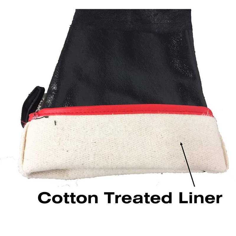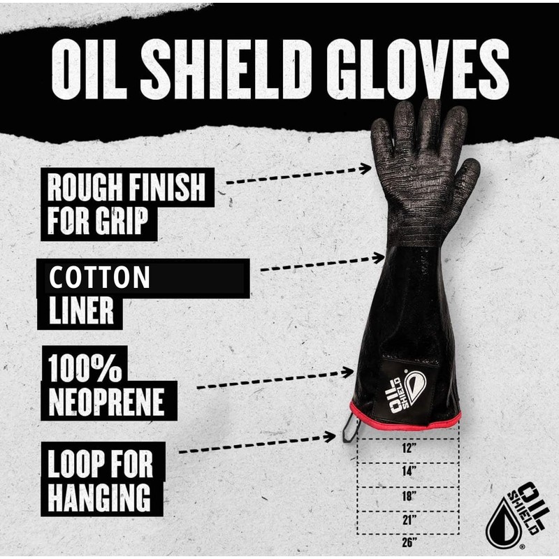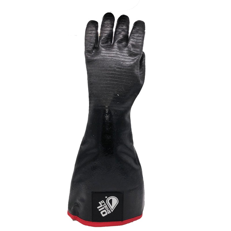 Oil Shield 100% black neoprene high heat gloves are tested to withstand temperatures up to 450 degrees. They are water proof with a cotton liner. Rough finish provides excellent grip in wet or oily conditions.