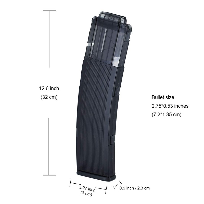 • The bullet clip can hold 22 foam or soft bullets.Bullet size: 2.75*0.53 inches/7.2*1.35 cm.