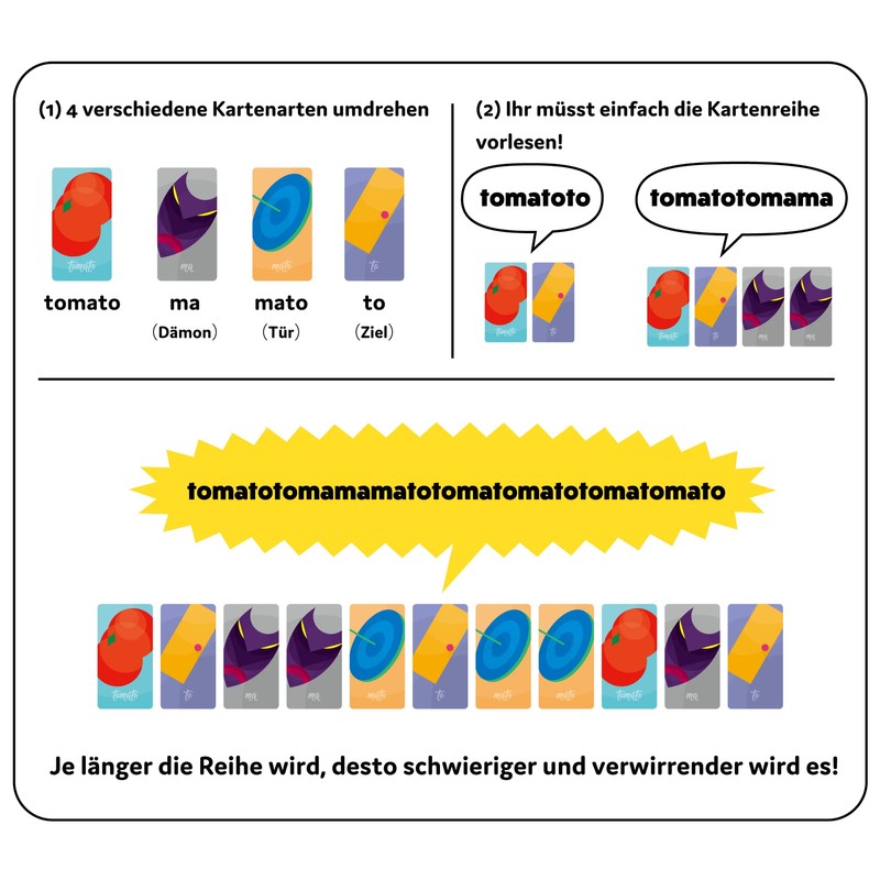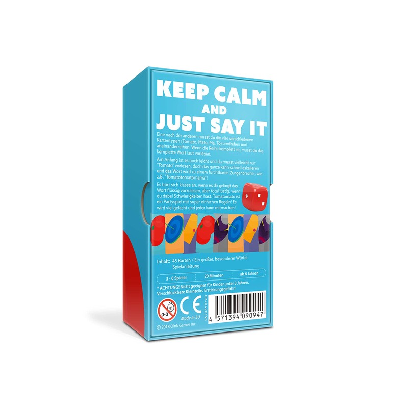 - Stay calm and just say it! - You have to flip 4 different card types (Tomato, Mato, Ma, To) and string them together. When the series is complete, you must read the word aloud. It creates funny tongue twisters such as "Tomatotomatomama".