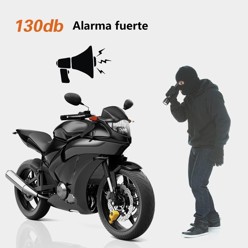 - Alarma potente de 130dB: El candado de freno de disco tiene una alarma integrada de 130dB con sensor de movimiento. Un simple clic activa el candado, que entra en modo de alarma y emite un sonido fuerte cuando detecta vibraciones, ahuyentando a los ladrones.