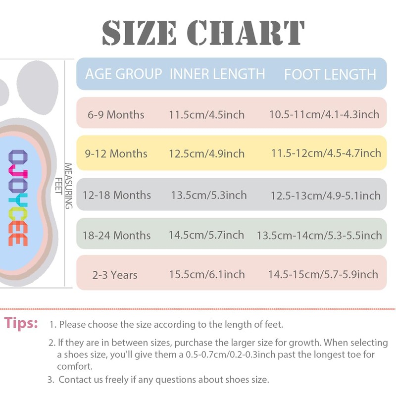 Please pay attention to the size of the shoes when purchasing. Shoes are the length of the inner insole. We recommend that you measure the baby's feet and increase the length by 0.5cm/0.2inches before buying.