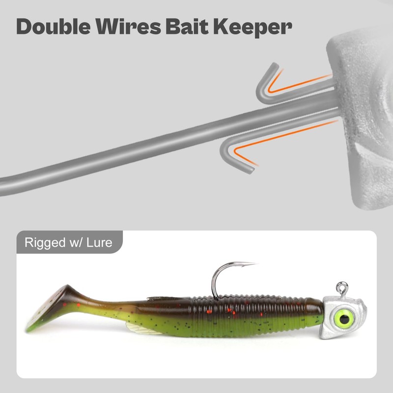 - The double wires bait keeper can firmly secure the plastic bait to the hook shank with minimal damage to the bait.