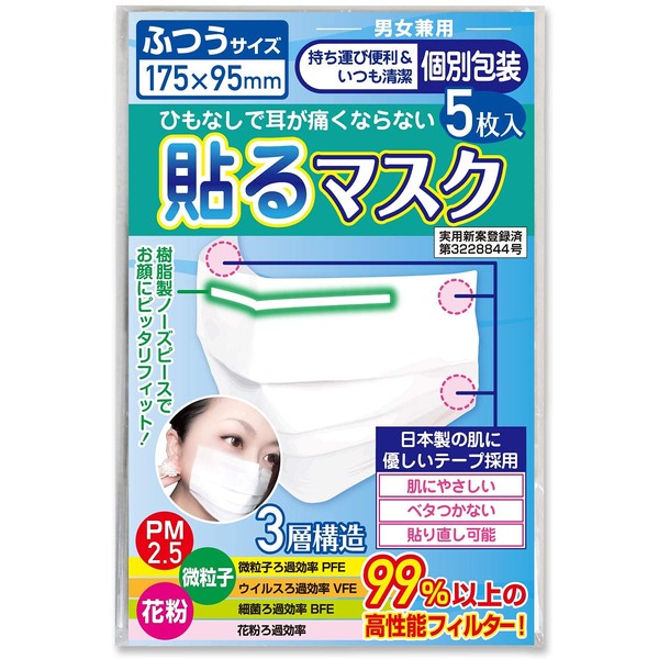 [あんしんや] 貼るマスク ひもなしで耳が痛くならない 男女兼用 貼りなおしOK PFE99%以上【5枚入】