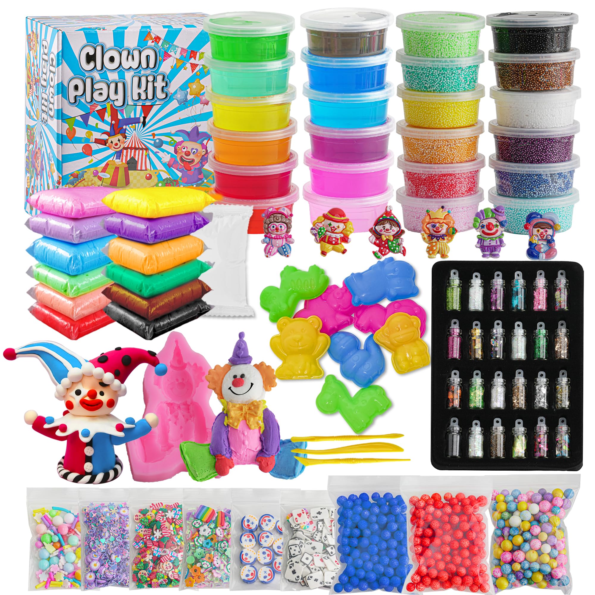 - Funny Clown Theme ToyThis clown set includes 6 cute clown charms & 6 slime soft slices that you can use to decorate your slime or clay. There is also a clown silicone mold, try using different colors of clay to create your own clay clown!