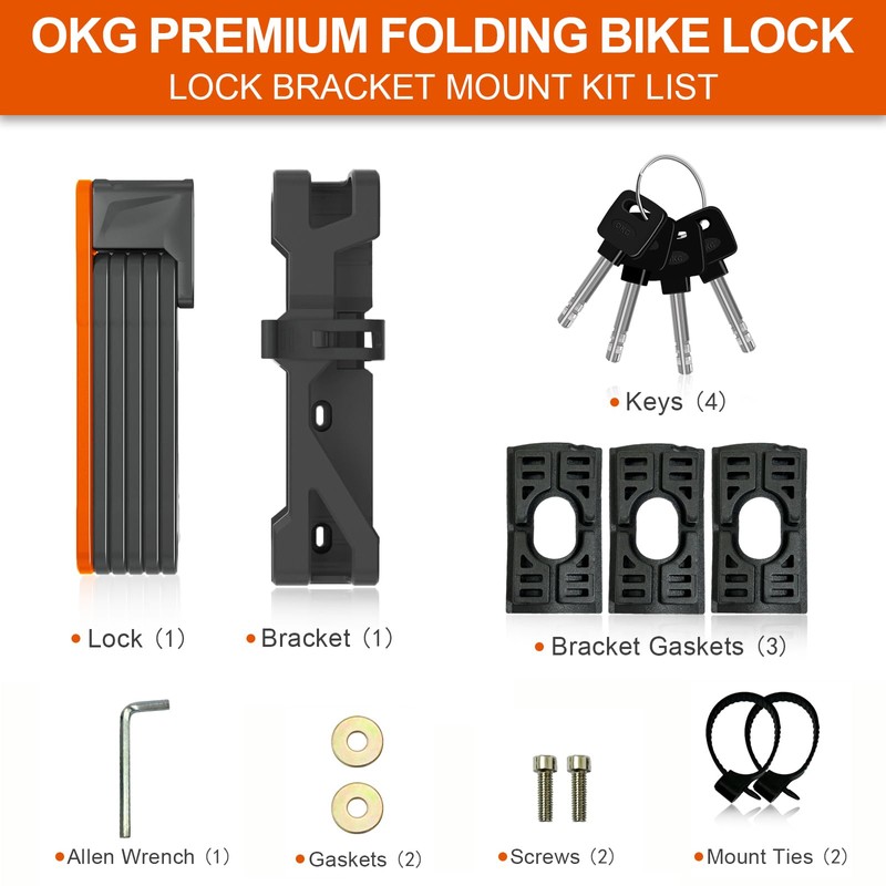 OKG Folding Bike Lock - 4 Keys, 3.7 lbs, Foldable Bicycle Lock, 8/10 Security Grade, Hardened Steel - Anti-Theft, Anti-Cut, Anti-Pry, with Mount Bracket Kit- for E-Bikes, Scooters (95cm, Orange-Black)