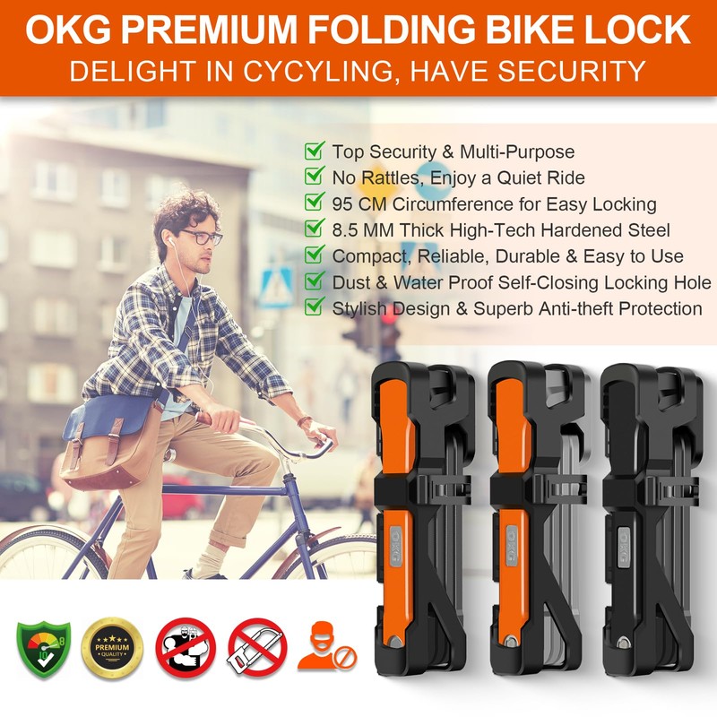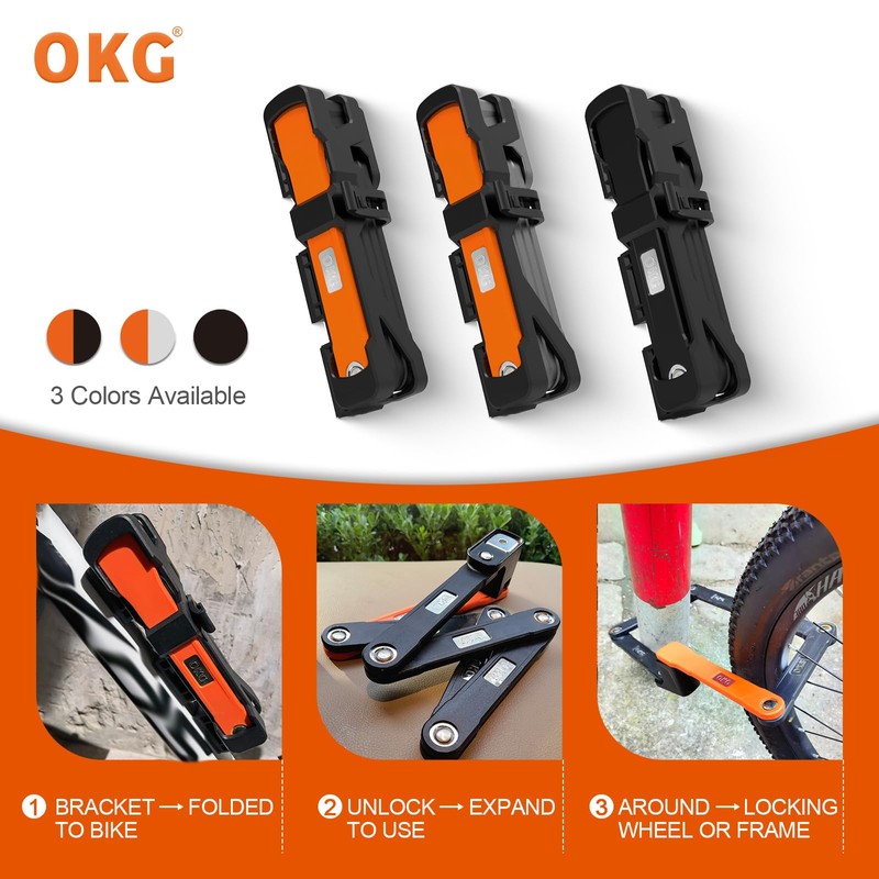 - ✓ VERSATILE & NO NOISE AND LESS SPACE - OKG high security folding bike locks take up less space in a bag than U lock or chain lock and fit silently against the bike frame. The compact foldable lock is well suited for locking around fixed objects such as posts, bike lock stands, and bike ground anchors. It is great for securing bicycles, e-bikes, pedicels, electric bikes, mopeds, scooters, mountain bikes, motorbikes, bike trailers, and two-wheeled vehicles.