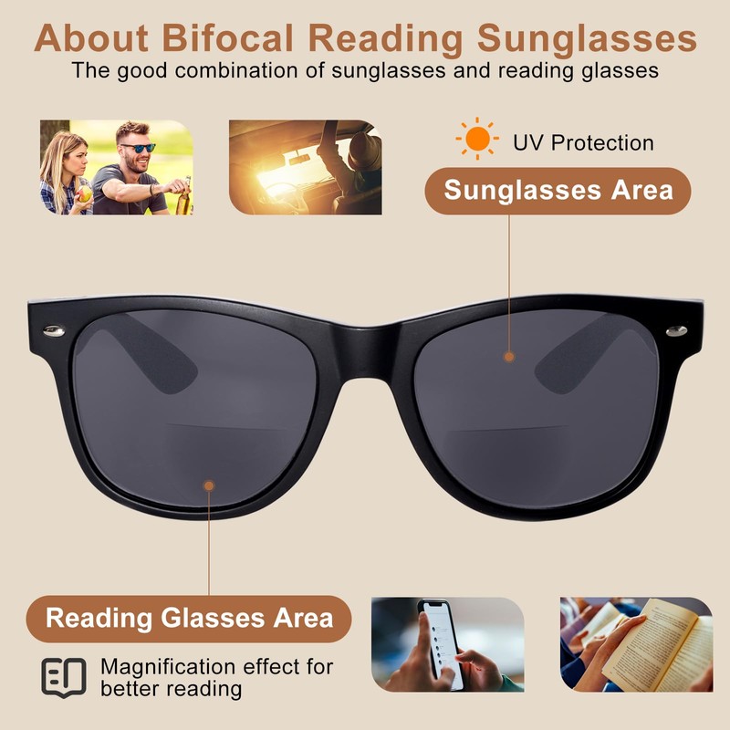 - Bifocal lenses: Bifocal lenses allow our readers to offer high versatility. Combine sunglasses with reading glasses. Perfect for outdoor reading and distance observation. Sunglasses with bifocal readers are comfortable. It is multifunctional, you don't have to wear multiple pairs of glasses and also save money.