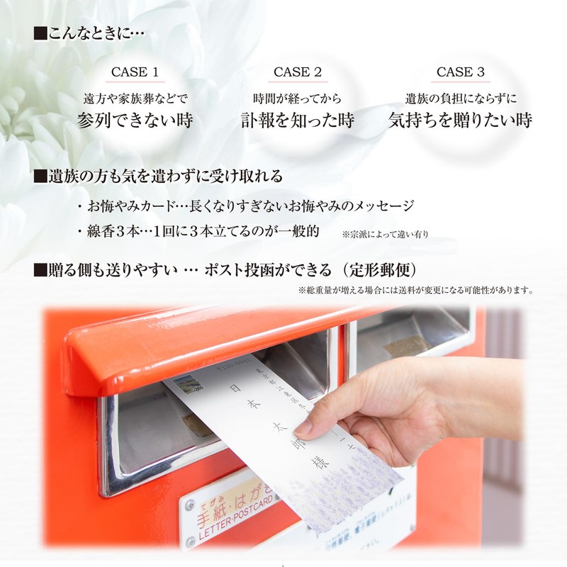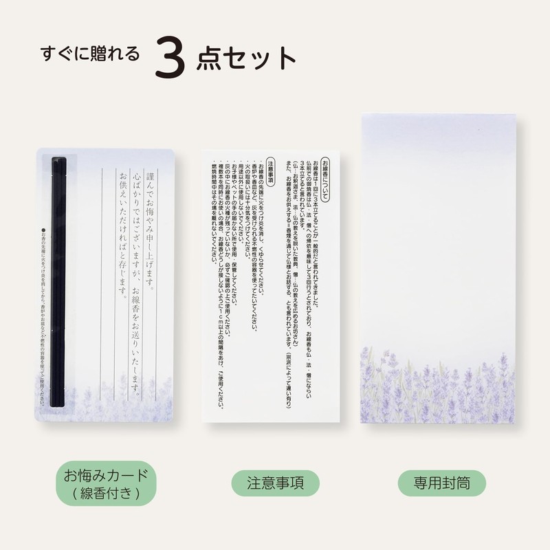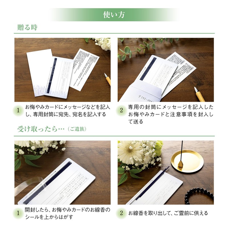 • Set Contents: Sympathy card (with incense sticks), Precautions, Dedicated envelopes