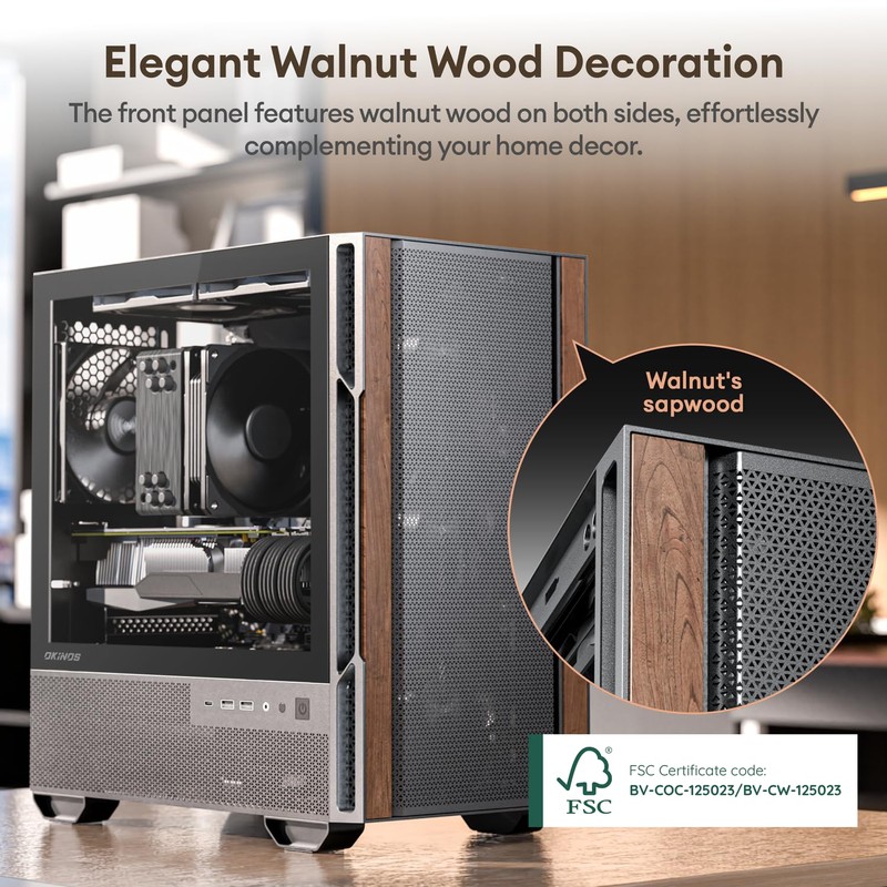Okinos Genuine Walnut Wood Micro ATX Case, MATX PC Case with 4 × 120mm 3 Pin Non-PWM Case Fans Pre-Installed, Temper Glass Side Panel, with Type-C, Black, Cypress 3 Wood