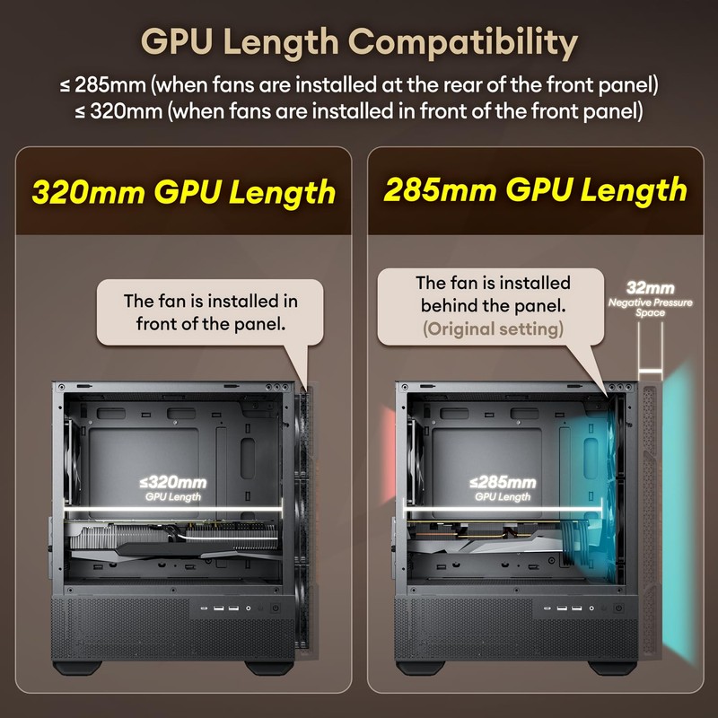 - GPU Compatibility285mm (When the fan is installed at the rear of the front panel); 320mm (When the fan is installed in the front of the front panel).