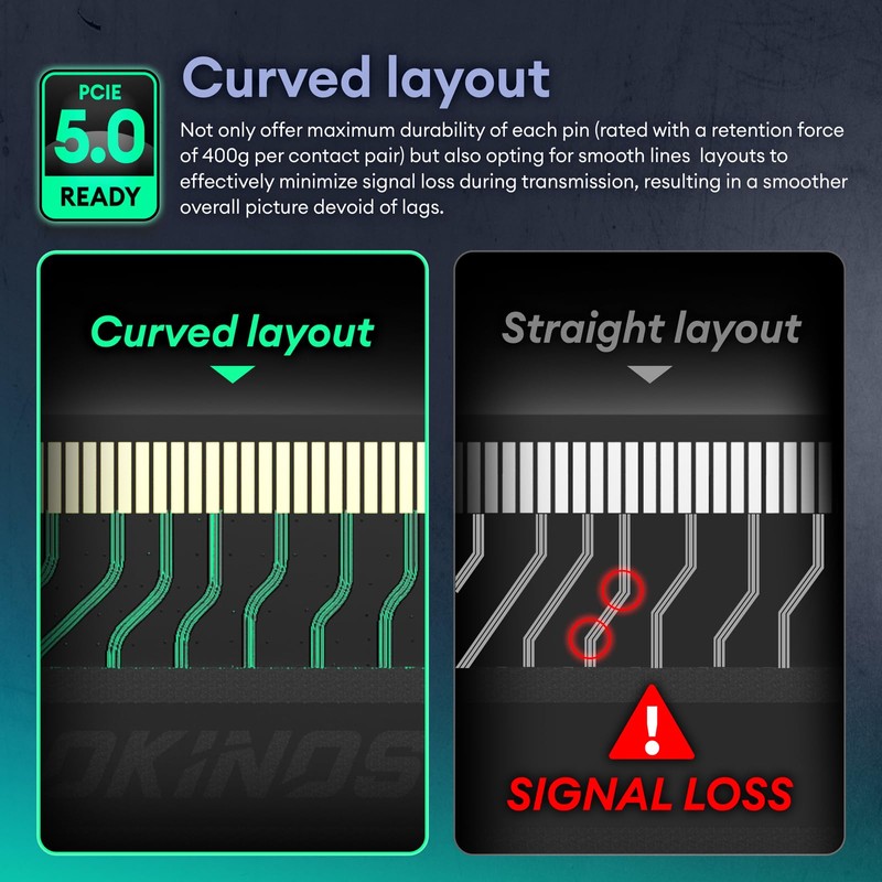 - Curved layoutNot only offer maximum durability of each pin (rated with a retention force of 400g per contact pair) but also opting for smooth lines layouts to effectively minimize signal loss during transmission, resulting in a smoother overall picture devoid of lags.