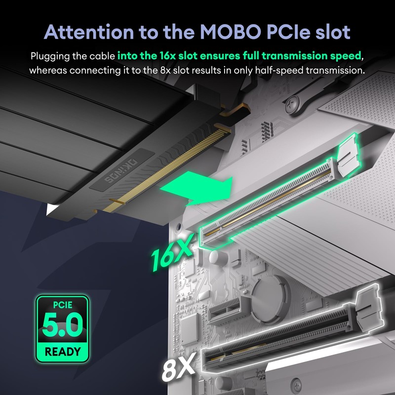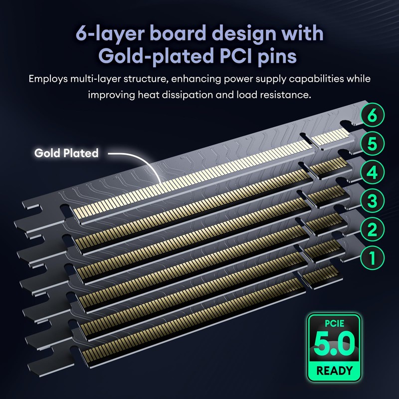 - 29 AWG wire specificationEnsuring stable signal transmission compared to the commonly used 30AWG in PCIE 4.0. Each copper wire's diameter is increased from 0.287mm to 0.305mm. Transmission speed depends on GPU model, our PCIE 5.0 Riser Cables ensures that it meets the maximum transmission speed for all GPU.)