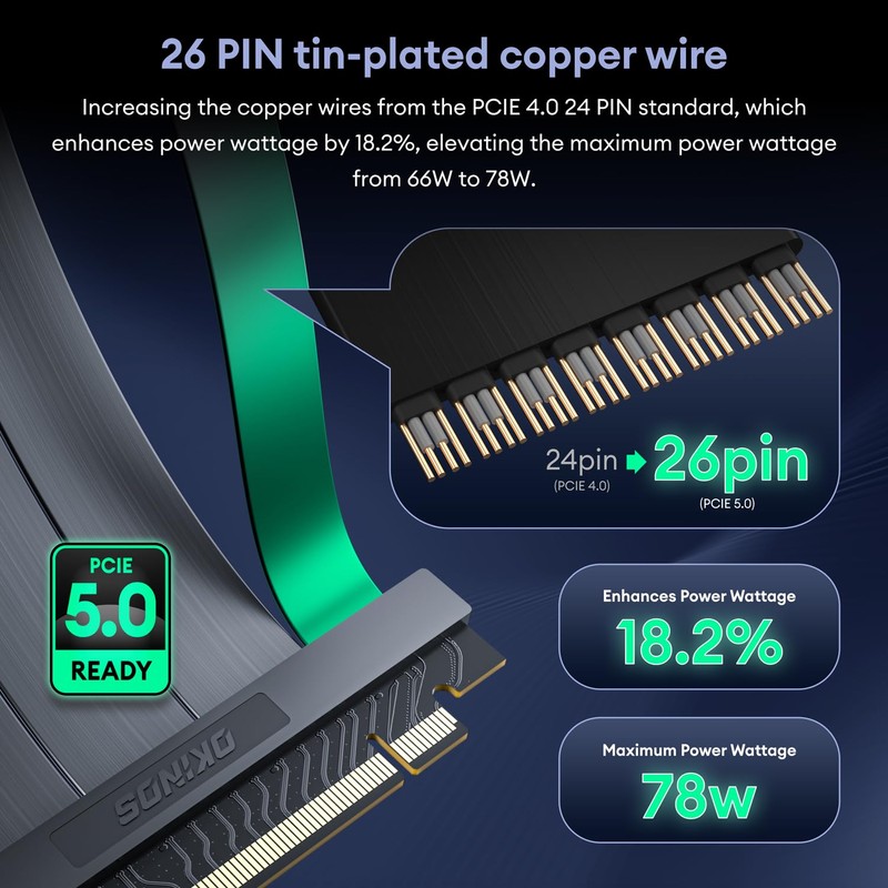 - 26 PIN tin-plated copper wireIncreasing the copper wires from the PCIE 4.0 24 PIN standard, which enhances power wattage by 18.2%, elevating the maximum power wattage from 66W to 78W.