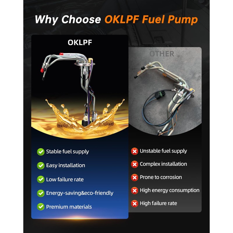 - Premium quality: Oklpf electric fuel pump has undergone a number of professional tests to ensure reliable operation and consistent fuel delivery. Each fuel pump module assemblies are made of premium quality materials to enhance your vehicle's performance, increase acceleration,improving fuel efficiency,reduce vibration, noise,etc