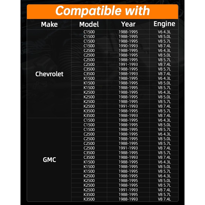 - Compatible with: 1988-1995 Chevy C1500/C2500/K1500/K2500 V6 4.3L/V8 5.0L/V8 5.7L,1990-1993 C1500 V8 7.4L,1991-1993 C2500/K2500 V8 7.4L;1988-1995 GMC C3500/K3500 V8 5.7L,1988-1993 C3500/K3500 V8 7.4L