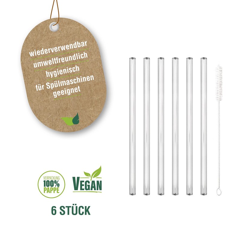 - 🥤 Lieferumfang: 6 Glas-Strohhalme mit einer Länge von 15 cm, verpackt in nachhaltigem FSC-Karton.