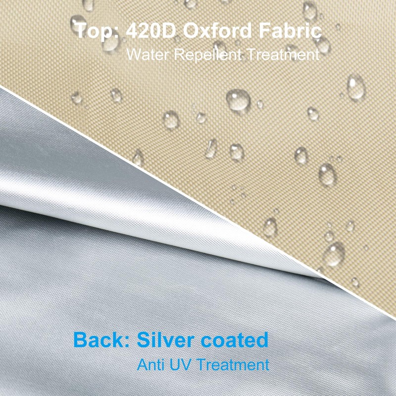 Durable material: 420D heavy duty Oxford fabric with inner PU coating and double stitched bound edges preventing this waterproof patio umbrella covers from tears.