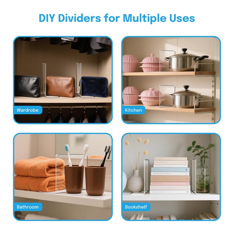 • Versatile 4-Pack for Whole-Home Organization: Maximize your storage potential throughout your home with this generous 12 PACK of baby closet dividers. Ideal as shelf dividers for closet organization, they are also perfect for tidying up your kitchen cabinets, decluttering bathroom shelves, or organizing books in your bedroom. Their sturdy and easy to install and remove nature makes them a go-to solution for any area needing better organization, truly enhancing every corner from closet to cabinet.