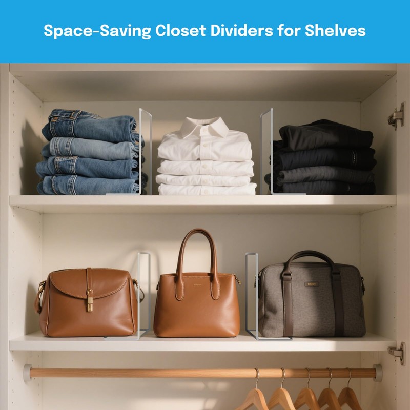 • Adjustable & Flexible for Tailored Compartments: Transform cluttered shelves into perfectly organized spaces with our easily adjustable shelf divider system. Whether you're organizing clothes, purses, handbags, or towels, these Space-Saving clothes dividers for closets can be repositioned as your needs change. This 12 PACK allows you to customize compartment sizes in your bedroom, bathroom, or closet, making it simple to separate and categorize everything from bulky jackets to delicate dresses.
