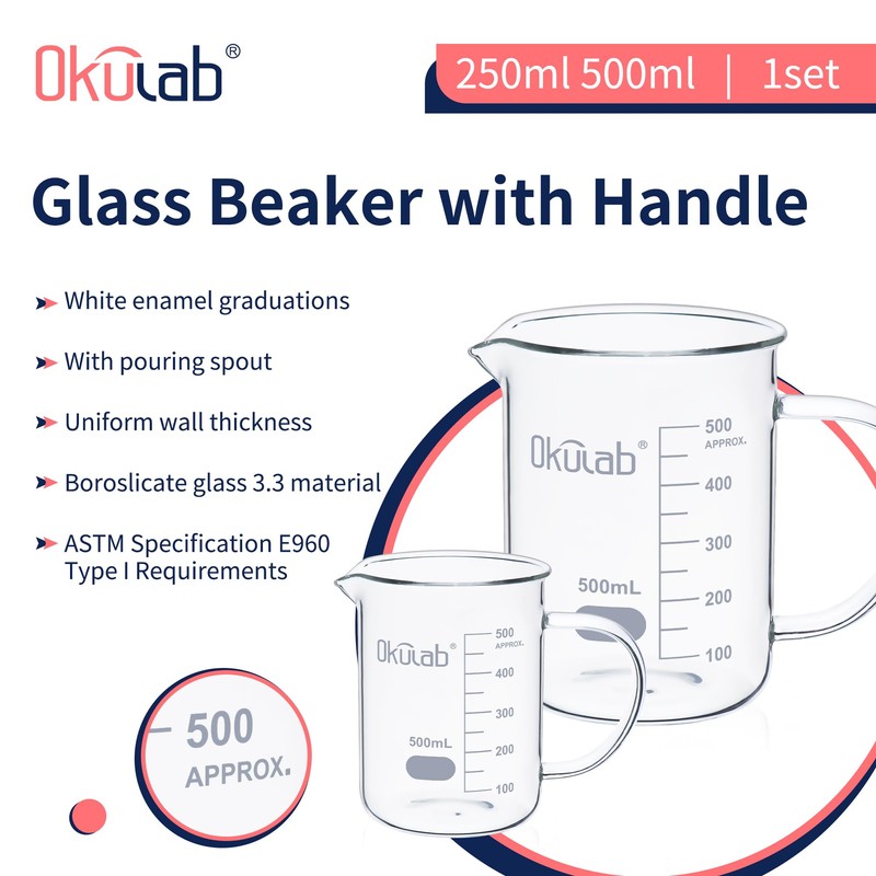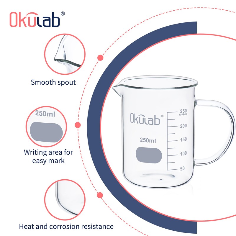 Okulab Glass Beakers Set, Vol 250ml 500ml 3.3 Borosilicate Glass Beaker Measuring Cups with Spout for Laboratories, Classrooms or Home, Lab Beakers, BKLGHS2A1