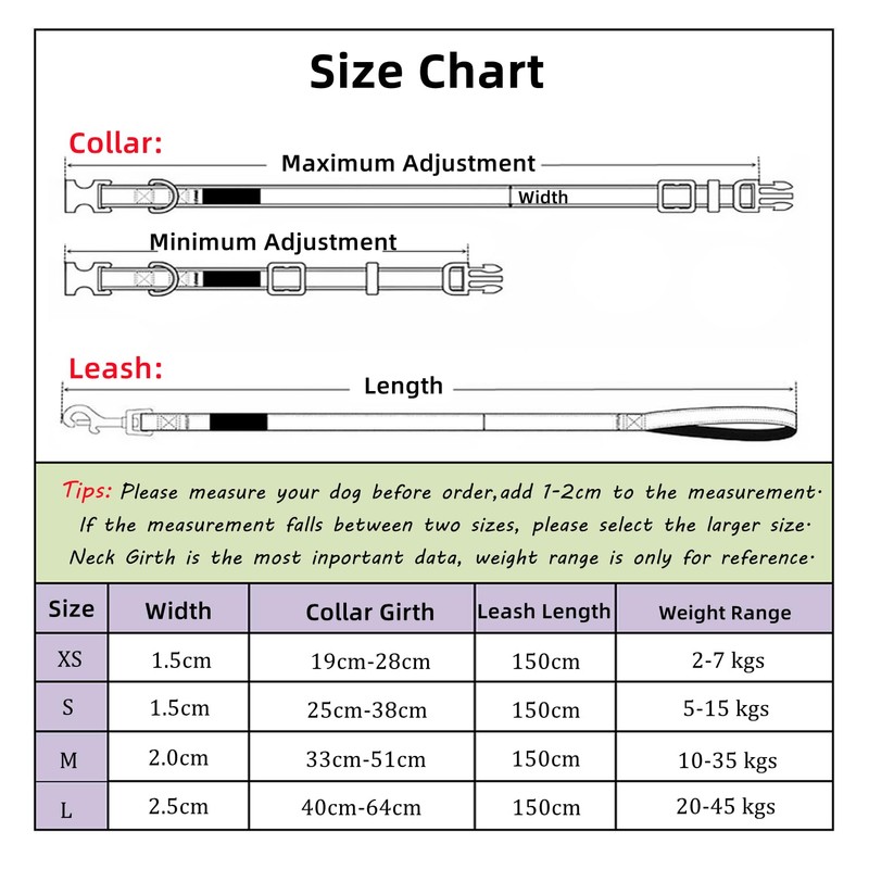 XS Size: Collar:1.5CM*19CM-28CM,Leash:1.5CM*150CM.