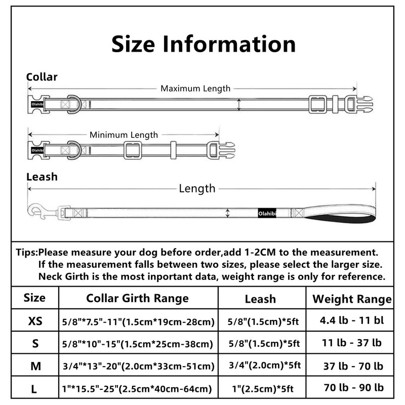 L Size: Collar:1"*15.5"-25"(2.5CM*40CM-64CM), Leash:1"*5ft.
