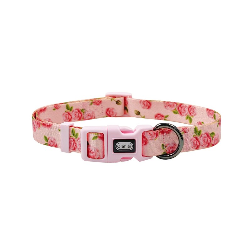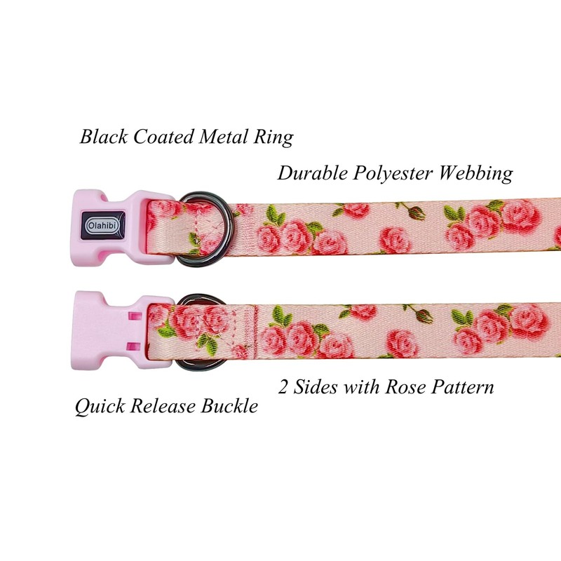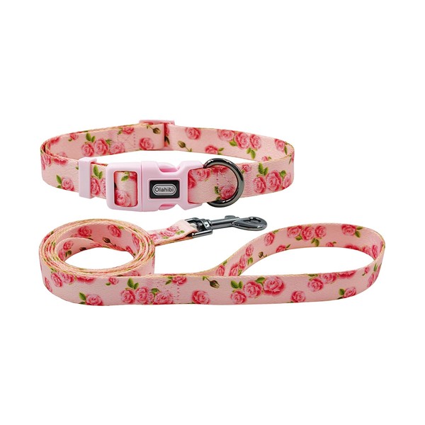 Olahibi Dog Collar Leash Set, Floral Pattern, Polyester Material, Adjustable Collar and 5ft Matching Leash, for Small Dogs.(S, Pink Rose)