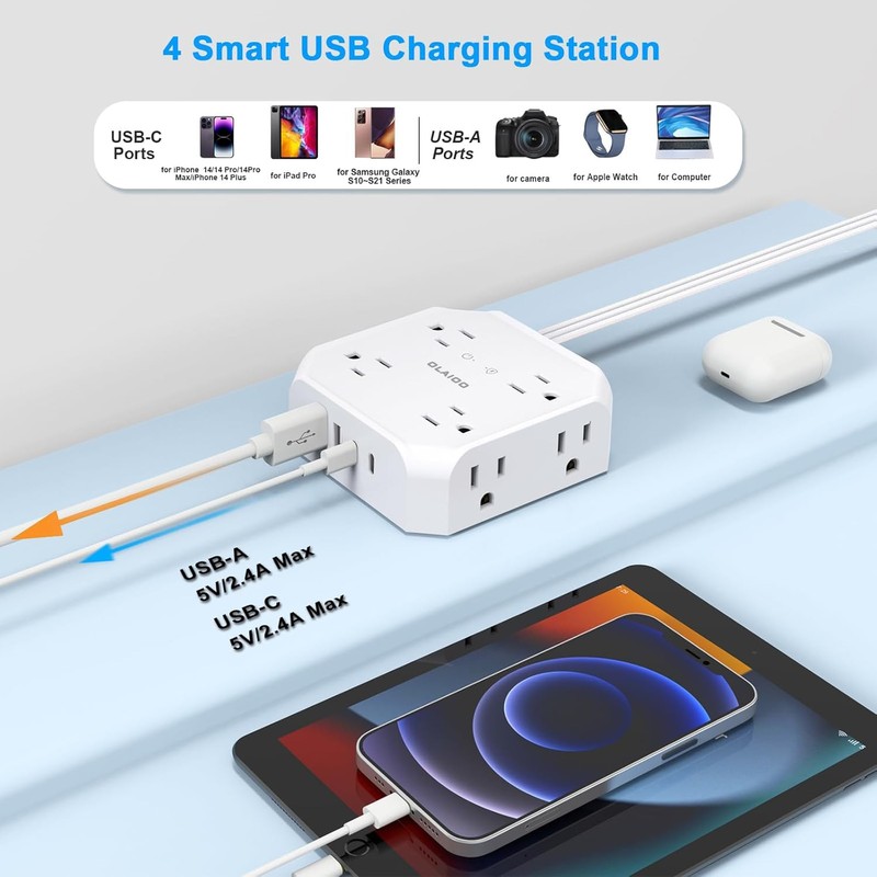 - [Estación de carga USB inteligente] Se han añadido dos puertos USB C y dos puertos USB A para satisfacer las diferentes necesidades de carga, cada uno de los puertos de la regleta de alimentación puede cargar hasta 5V/2.4A Max. Con la tecnología de carga inteligente, el extensor de toma de corriente puede auto-detecta sus dispositivos y alcanzar la eficiencia de carga más rápida, compatible con casi todos los dispositivos USB (la corriente real se decide por la demanda de los dispositivos), perfectamente adecuado para su iPhone, iPad, tableta, auriculares, etc.