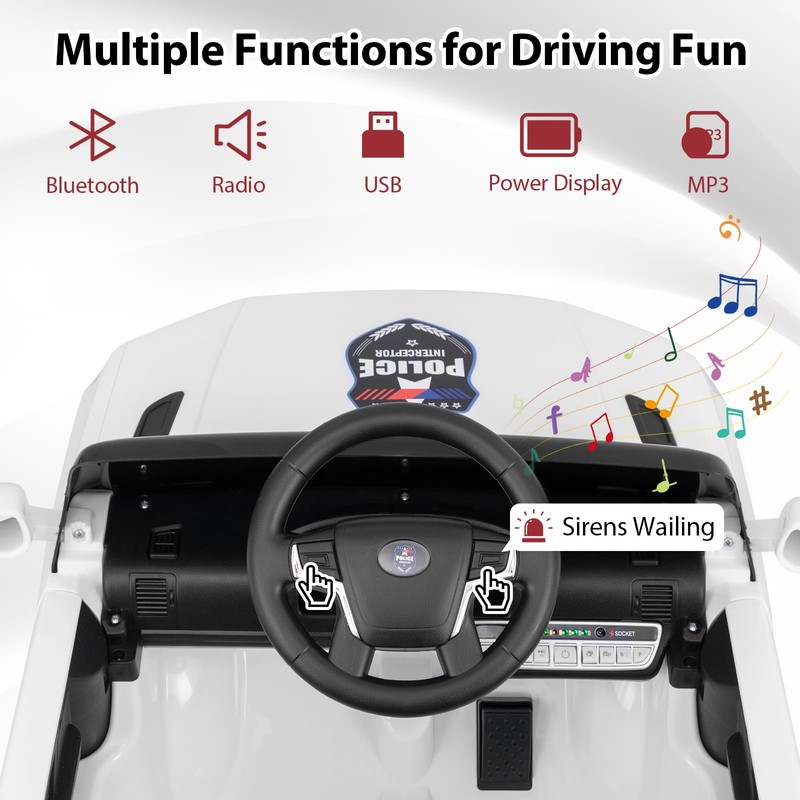 OLAKIDS Ride on Police Car, 12V Kids Battery Powered Electric Vehicle with Siren, Flashing Lights, Bluetooth, Music, MP3, USB, Power Display, Spring Suspension, Aged 3-8 Years (White)