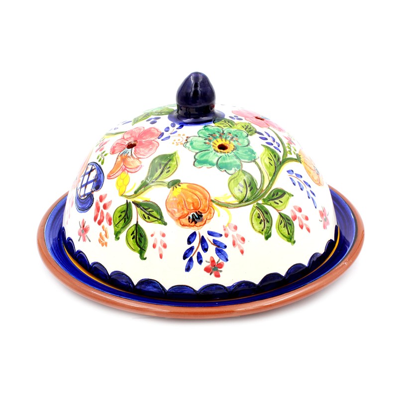Handmade in Portugal by the renowned ceramic pottery artist, Carrilho Lopes, this Covered Cheese Dish comes from the village of Corval, in Alentejo, Portugal, known for its fine ceramics and considered the Iberian capital of pottery. This dish presents a floral pattern with rich colors that will stand out on your table, but will also be a spectacular decorative piece.
