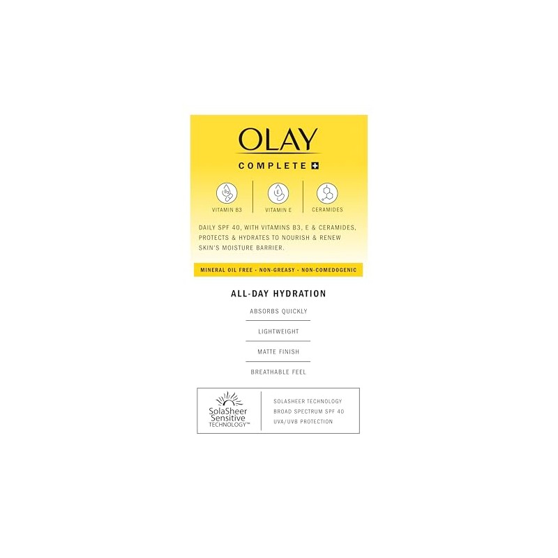 Hydrate your skin while protecting it from the sun. Complete+ Daily Facial Moisturizer with Sunscreen offers deep hydration to nourish your skin. It leaves a lightweight, matte finish while protecting from sun damage, thanks to broad spectrum SPF 40 SolarSheer technology. No greasy residue. No white cast. Finally, a 3 in 1: Protect, nourish, and renews your skins moisture barrier. Use Complete+ Daily Facial Moisturizer for: POWERFUL SPF sunscreen to help prevent sun damage INSTANT healthy, glowing skin INSTANTLY has a weightless feel LONG-LASTING hydration GENTLE, soothing formula designed for sensitive skin The lightweight face moisturizer with sunscreen is dermatologically recommended by the Skin Health Alliance with no mineral oil, phthalates, parabens, or synthetic dyes. This fragrance-free hydrating face lotion will leave your skin feeling and looking healthy. Its the care your skin needs, all in a recyclable bottle. How to apply: 1. Apply liberally 15 minutes before sun exposure. 2. Reapply at least every 2 hours. 3. Use water-resistant sunscreen if swimming or sweating. At Olay, we're serious about our commitments. Our Olay Skin Promise to you is zero skin retouching in all advertising. Olay is the first mass skin care brand in the U.S. to take this stance because we know real beauty is honestly beautiful. We also guarantee you'll love your Olay product. If you are not satisfied, we'll give you your money back via a prepaid card. Must submit within 60 days of purchase.