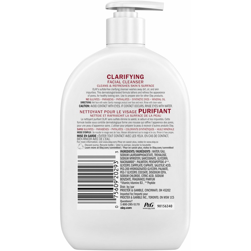 Cleanse your way to fresh and prepped skin. OLAY Clarifying Daily Facial Cleanser with Niacinamide + Peptide 24 delivers sulfate-free cleansing for healthy-looking skin. This lightly scented, translucent cleanser lathers to remove dirt, oil, and impurities without drying out skin, plus it refines the appearance of pores. Formulated with Niacinamide (Vitamin B3), Peptides, and Glycerin, this face wash is gentle enough for daily use.