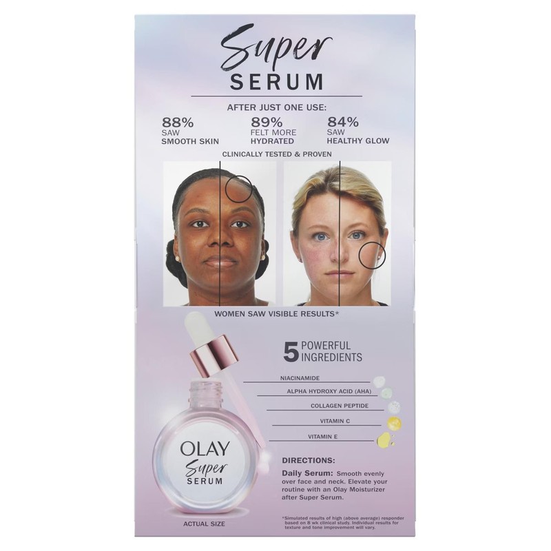 Olay Super Serum is designed to work on diverse skin types, ensuring visible results from day 1.
